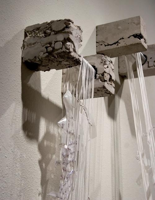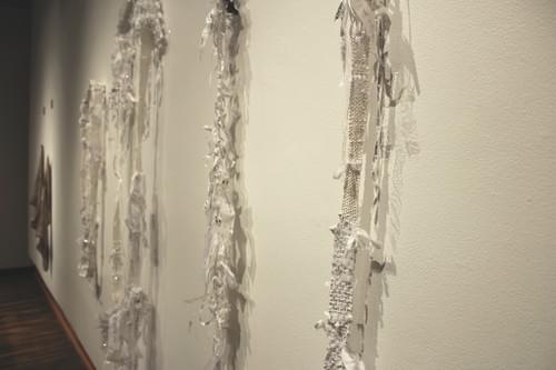 Bond Heal Loss asks a person to use the intimate process of weaving warp into weft to explore their personal ideas associated with the terms bond, heal, loss. A small white shelf held a variety of media and a set of instructions that asked the viewer to become the maker.